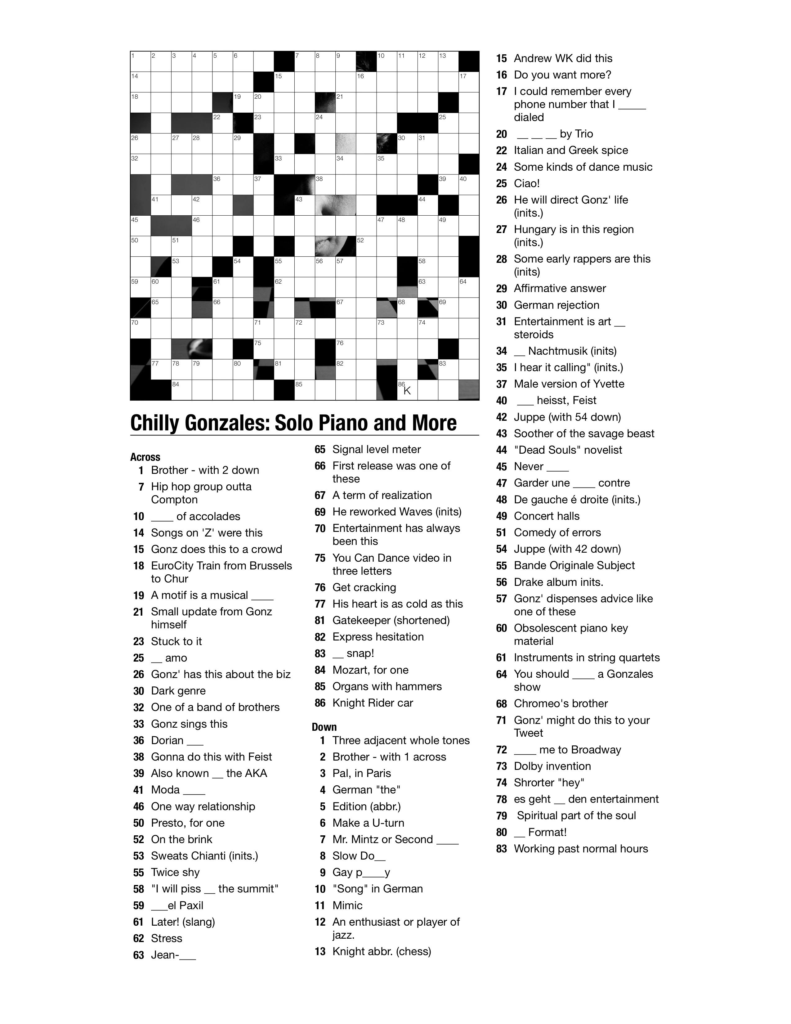 Response to the first Solo Gonzales puzzle was overwhelming – happy to hear that so many Chilly Gonzales fans up for a challenge. As promised, we have developed puzzle number two, and we think it’s even a bit trickier than the first. This puzzle mainly covers from Presidential Suite all the way to Ivory Tower, and (as always) almost all of the clues are Gonz-related in some way.