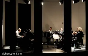 A monopteron, temple of the Muses and symbol for classicism and the ancient Greek conception of man, is the home of Chilly Gonzales and the Kaiser Quartet (plus an additional flute and horn player) for the duration of the play. White projection surfaces appear to the left and right, which either make the actors become black silhouettes or serve as a background for the rare intertitles, which are mostly dialogues. No words are being spoken, but the acting speaks for itself – or as Faust put it: “In the beginning was the deed”. Body language, exaggerated facial expressions, elements of dance, pantomime and slapstick replace the language and together with the music, the impact on the audience is even more intense than a verbal flood. The music is actually the play’s core. Chilly Gonzales’ composition ranges between Hitchcock, classical romantic exponents, Tom & Jerry, and the Love Boat theme song, and interacts straight with one’s center of emotions.